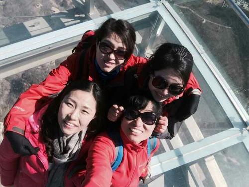 本次团队活动设置一个游戏难关——挑战玻璃栈道。悬空跨度32.8米的观景台距离崖底400米,比美国科罗拉多大峡谷的廊桥还长11.4米;415平米的载员面积,是迄今为止世界上面积最大的观景平台。观景台以飞碟为原型,悬浮于空中,型似鹰眼且雄伟壮观,故而谓之“宇宙之眼”。置身台上,玻璃剔透,下视无碍,似无所依,令人举步惊心。